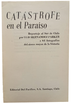 (TE11) - Santiago de Chile - 2° edición, 1 de diciembre de 1960 - Reportaje al Sur de Chile por Luis Hernández Parker y 61 fotografías del sismo mayor de la historia - Proyectó la edición Mauricio Amster - Contiene 198 páginas más apéndice con fotografías en blanco y negro - Encuadernación rústica - Desgaste en lomo y tapa trasera - Falta tapa principal - Timbre de dueño anterior en hoja de respeto - Regular estado |
