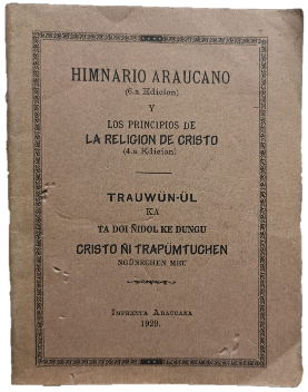 (OO41) - Valdivia - 2 obras en un ejemplar - En español y en Mapudungun - I: Himnario Araucano-Trauwun-il ka: Contiene 50 páginas más índice - II: Los Principios de la Religión de Cristo-Ta doi ñidol ke dungu Cristo ñi trapumtuchen - Encuadernación rústica - Leve desgaste en lomo, perímetros y puntas - Lomo y perímetros levemente descoloridos - Leve desgaste en tapas - Buen estado |