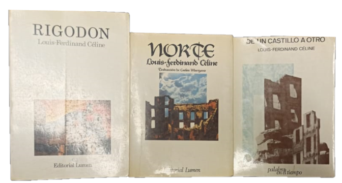 (ZZDE3) - Barcelona, España - Tres volúmenes - Colección dirigida por Antonio Vilanova - De un Castillo a Otro contiene 377 páginas - Norte: año 1980, Primer edición, contiene 506 páginas - Rigodon: contiene 207 páginas - Los 3 ejemplares con encuadernación rústica y de la editorial Lumen - Leve desgaste en lomos, perímetros y puntas - Firma de dueño anterior en hoja de respeto en todos los ejemplares - Buen estado |