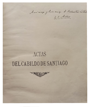 (OOO1) - Santiago de Chile - Dedicado y Firmado por el autor en ante portada a Valentín Letelier - Publicadas con ocasión de la celebración del primer centenario de la independencia de Chile - Comprende las actas de las sesiones celebradas durante los años de 1810 al 23 de septiembre de 1814 - Contiene XVI+359 páginas - Encuadernado en media tela de color rojo - Guardas adornadas - Contiene algunas láminas a color y en blanco y negro - Lomo, tapas y puntas con leve desgaste - Buen estado