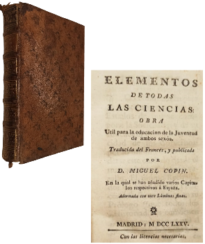 (TQ5) - Madrid - �til para la educación de la Juventud de ambos sexos. Traducida del francés y publicada por D. Miguel Copin en la qual se han añadido varios capítulos los respectivos a España. Adornada con once láminas finas - Contiene 399 páginas más índice - Contiene todas las láminas - Encuadernado en cuero completo - Hojas presentan leves pintas de óxido - Buen estado |