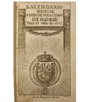 (OE21) - Madrid - 2 títulos contenidos en un volumen - I: Kalendario Manual y Guía de Forasteros en Madrid para el año 1817, contiene 214 páginas, mapa de la península de España coloreado y dos retratos, Fernando VII Rey de España y María Isabel Francisca, su esposa - II: Estado Militar de España año 1817, contiene 312 páginas incluyendo índice y mapa de las Cercanías de Madrid coloreado en su borde externo - Fina encuadernación de época en cuero completo con decoraciones en dorado - Cantos dorados - Lomo y puntas desgastadas - Regular estado |