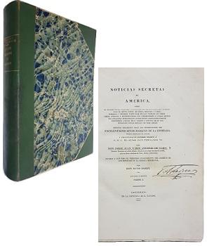 (SO) - Londres - Título Completo: "Noticias Secretas de América, Sobre el Estado Naval, Militar y Político de los Reynos del Perú y Provincias de Quito, Costas de Nueva Granada y Chile: Gobierno y Regimen Particular de los Pueblos de Indios: Cruel Opresion y Extorsiones de sus Corregidores y Curas: Abusos Escandalosos Introducidos entre estos Habitantes por los Misioneros: Causas de su Origen y Motivos de su Continuacion por el Espacio de Tres Siglos - Escritas fielmente segun las instrucciones del Excelentísimo Señor Marques de la Ensenada, primer secretario de estado, y Presentadas en Informe Secreto a S. M. C. el Señor de Don Fernando VI, por don Jorge Juan, y Don Antonio Ulloa - Sacadas a la luz para el verdadero conocimiento del gobierno de los españoles en la America Meridional por don DAvid Barry - Volumen dividido en 2 partes. Parte I: "Sobre el Estado Militar y Político de las Costas del Mar Pacífico. con 9 capítulos - Parte II: Sobre el Gobierno, Administración de Justicia, Estado del Clero, y Costumbres entre los Indios del Interior - Volumen encuadernado en medio cuero verde, en lomo y puntas de tapa - Tapas y guardas marmoladas - Con 2 láminas, en frontispicio de Parte I y en frontispicio de Parte II - Con X y 707 páginas - 'Ultimas páginas del apéndice con marcas de humedad y última página con pequeña merma y restauración en medio de texto Firma de dueño anterior en portada - En general, bueno |
