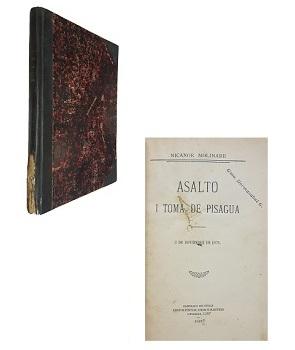 (OS42) - Santiago de Chile - Batalla ocurrida el 2 de noviembre de 1879 - Retrato en frontispicio - Un volumen de 170 páginas - Con 5 láminas desplegables y otras entre texto - Encuadernado en media tela negra - Merma de lomo en inferior - Reforzamiento en articulación de contratapa - Desgaste externo - Timbre de dueño anterior - Aceptable |