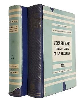 (XXF1) - Buenos Aires - Revisado por los señores miembros y correspondientes de la sociedad francesa de filosofía y publicado, con sus correcciones y observaciones - Lalande miembro del instituto, profesor de la sorbona, secretario general de la sociedad - Obra laureada por la academia Francesa - Traducción española de la quinta edición hecha por un conjunto de profesores bajo la dirección de Luis Alfonso - Tomo I (A-L) con 759* páginas - Tomo II (LL-Z) con 1502 páginas - Ambos ejemplares Encuadernados en tela completa azul de editorial, con sobrecubierta parcial (Mirad en tomo I y Mitad en tomo II), encuadrrnación en tela sin detalles, buen estado - Exterior: sobrecubierta externa parcial, en ambos tomos - Interior: bien - En general, buen estado. |