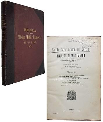 (SO) - Chorrillos, Perú - Memoria de la Misión Francesa en el Perú. Viaje de estado Mayor 18 de Marzo a 25 de junio de 1902. Descripción del Viaje, Estudios Tácticos, Trabajos Topográficos, por Coronel Paul Clement, Jefe de la Misión Militar Francesa. Sub-Jefe de Estado Mayor General, Director del Viaje. Con la Colaboración del Teniente coronel L. Bailly-Maitre de la Misión Militar Francesa, Jefe de la 3ra Sección del Estado Mayor General - Firmado y dedicado por Teniente coronel L. Bailly-Maitre - Con datos estadísticos, fotos y láminas desplegables - Encuadernado en medio cuero, cuero en lomo y en puntas - 33x23 cm - Algunos roces en lomo y en puntas - Interior: contratapa con mancha de humedad en borde - En general, buen estado |