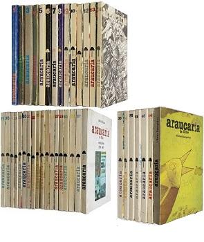 (TC51) - Madrid, España - 39 números, Editor: Volodia Teitelboim. Redacción: Carlos Orellana - Extracto Memoria Chilena: "Durante 12 años Araucaria de Chile fue, si no la más importante, una de las principales fuentes de creación, debate y difusión de ideas de la cultura chilena en el exilio, haciendo a la vez un inmenso aporte en el combate por la recuperación de las libertades democráticas y por el fin del oscurantismo cultural y social en que estaba sumido nuestro país..." - Colección de la revista consta de 32 números: 1, 2, 3, 4, 5, 6, 7, 8, 9, 10, 11, 12, 13, 14, 15, 16, 17, 18, 19, 20, 21, 22, 23, 24, 25, 26, 27, 29, 30, 32, 33, 34, 35, 36, 37, 40, 42, 44, Índice General (1978-1989) por Carlos Orellana y Araucaria de Chile (Obras escogidas) - Los 39 tomos de la revista Araucaria están con su encuadernación original rústica - Algunos roces externos - Buen estado |