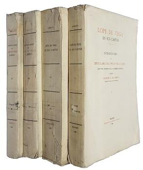 (TD71) - Madrid - 4 tomos, completo - "Lope de Vega en sus cartas. Introducción al epistolario de Lope de Vega Carpio que por acuerdo de la Academia Española publica Agustín G de Amezúa" - Editado en 1935 al 43 - Con XIV + 524 (incluye 8 láminas), 734, XCVIII + 406 y 394 páginas respectivamente - Los 4 ejemplares con encuadernación original en rústica - Interior en buen estado, volúmenes intonsos - Exterior: lomos con roces y pequeñas manchas. Cantos algo sucios. Tomo I: tapa trasera con pequeña mancha en borde. Tomo IV: Mancha en borde de tapa - Estado general: Correcto estado