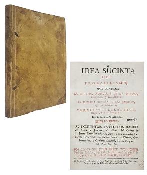 (OE41) - Lima, Peru - Título completo de portada: "Idea Sucinta del Probabilismo, que Contiene la Historia Abreviada de su Origen, Progresos y Decadencia: El Examen Critico de las Razones, que lo Establecen, y un Resumen de los Argumentos, que lo Impugnan. Por don Juan Lope del Robo quien la dedica al Excelentisimo Señor don Manuel de Amat y Junient, Caballero del Orden de S. Juan, Gentilhombre de Camara con Entrada, Teniente General de los Reales Exercitos, Virrey, Gobernador, y Capitan General, de los Reynos del Peru - Por Mano del Señor Doct. Don Joseph Perfecto de Salas, Fiscal de la Real Audiencia de Chile y Asesor General de Ellos, Reyno del Peru" - Encuadernación de época en pergamino - Con 127 páginas - Canto pintado - Notas de primer dueño en anteportadas - Cuero en buen estado, con marcas oscuras. Interior bueno - En general: buen estado |