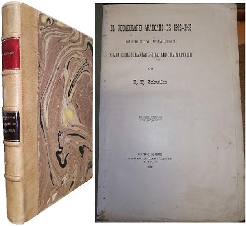 (OO51) - Santiago de Chile - 27 x 19 cm - Con notas críticas i algunas acciones a las bibliografías de la lengua Mapuche - Contiene 286 páginas - Ejemplar N° 006 - Firmado por el autor - Mapa - Láminas - Firma del dueño anterior - Encuadernado en medio cuero café claro con parches en el lomo - Tapas marmoladas - Conserva tapas originales (algo sucias y restauradas) - Barbas - Mapa desplegable - Pintas de óxido - Buen estado |