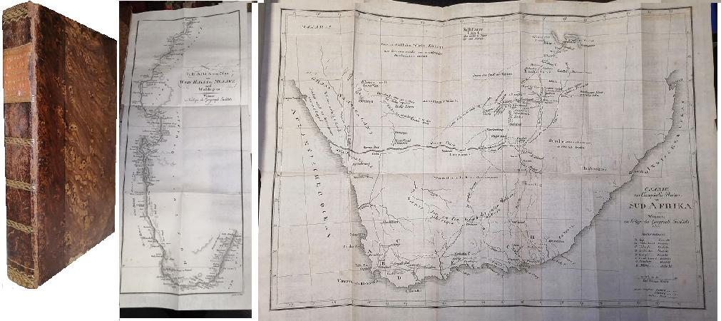 (OS52) - Weimar - 20 x 12 cm - 2 obras escritas en alemán antiguo, en un volumen: La primera obra es "Reise in verschiedene Gegenden Aethiopiens" (Viaje a diferentes xonas de Etiopía), contiene 188 páginas más un mapa desplegable que muestra el Nilo desde Wady Halfa a Merawe (45x20 cm) - La segunda obra es "Reisen in Sud - Africa auf Veranlassung der Missions Gesellschaft zu London unternommen" (Viaje a Sudáfrica por iniciativa de la Sociedad de la Misión en Londres) por John Campbell, "die zweite Reife, welche der Verfasser in das Innere jenes Landes Machte" (Segundo viaje hecho por el autor a ese país), contiene 300 páginas más un mapa desplegable de Sud-África (34x46 cm) - Encuadernados en medio cuero con parche en el lomo y pubnteras del mismo material - Guardas marmoladas - Ambos mapas se encuentran en buen estado de conservación - Pocas pintas de óxido - Lomo y tapas con leve desgaste y pequeñas rasgaduras superficiales - Cantos algo sucios - Buen estado |