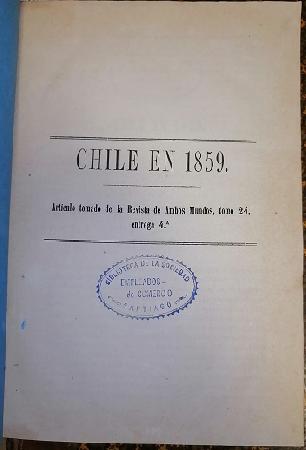 (ON61) - Chile - 22 x 15 cm - Cuatro obras sobre Chile encuadernadas en un volumen: I: "Chile en 1859", A. Cochut (autor), Imprenta Nacional, 1860, contiene 48 páginas - II: Chile, por Benjamín Vicuña Mackena (escrito en inglés), Times Printing House, Philadelphia, contiene 48 páginas (sin año de edición) - III: "Una Carta a Propósito de la Guerra entre Chile i las Repúblicas del Perú i Bolivia", Hermójenes de Irizarri, Imprenta Nacional, diciembre de 1880, contiene 38 páginas - IV: "Der Bürgerkrieg in Chile" mit porträts, karten und plänen, Hugo Kunz, Leipzig, In Commission Bei F. A. Brockhaus, año 1892, contiene 195 páginas, con retratos y planos - Todo encuadernado en medfio cuero café con parches rojos en el lomo - Tapas marmoladas - Lomo con algo de desgaste - Sello y timbres de la Biblioteca de la Sociedad de Empleados de Comercio - Conservan tapas originales - Buen estado |