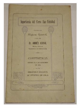 (ON61) - Santiago de Chile - Dr. Andrés Koenig Médico-Cirujano, Especialista en Hydroterapia - Conferencia dictada el 8 de noviembre de 1918 en la Biblioteca Nacional de Santiago de Chile - Contiene 22 páginas - Encuadernación rústica - Leve desgaste en lomo - Pintas de óxido - Tapas obscurecidas y con suciedad - Tapa posterior con merma de material - Estado aceptable |
