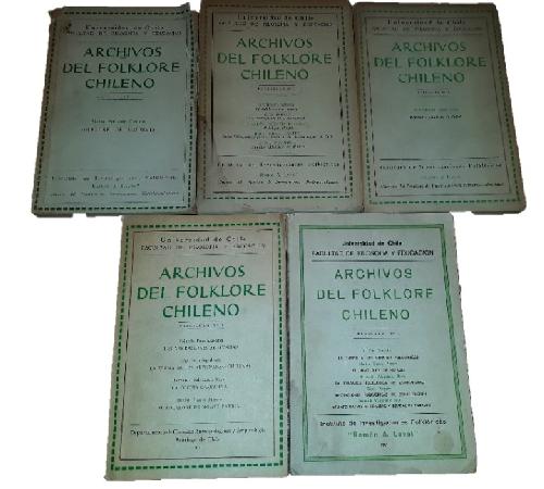 (TG32) - Santiago de Chile - 5 volúmenes de 9 - Universidad de Chile, Facultad de Filosofía y Educación - Instituto de Investigaciones Folklóricas "Ramón A. Laval", (Sección del Instituto de Investigaciones Histórico-Culturales) - Fascículo 1: Abdón Andrade Coloma: Folklore de Valdivia - Fascículo 2: Richard Weiss: El Folklore como ciencia, R.S. Boggs: La Investigación de la adivinanza, Evaristo Molina Herrera: Mitología chilota, Raúl Silva Castro: Notas bibliográficas para el estudio de la "poesía vulgar" de Chile, Elisa Figueroa: Apuntes folklóricos de Malleco - Fascículo n°5: Galvarino Ampuero: Repertorio Folklórico de Chilóe - Fascículo 8: Y. Pino Saavedra: En Torno a los Cuentos Folklóricos, Marino Pizarro Pizarro: El Niño Dios de Sotaqui, Bernardo Valenzuela Rojas: La Cerámica Folklórica de Quinchamalí, Elena Wegener: Anotaciones Folklóricas de Constitución, Bernardo Valenzuela Rojas: Apuntes breves de comidas y bebidas de Carague - Fascículo 9: Yolando Pino Saavedra: Las Narraciones Araucanas, Olga Pino Sepúlveda: La Forma de las Adivinanzas Chilenas, Bernardo Valenzuela Rojas: La Cocina Campesina, Marino Pizarro Pizarro: El Folklore de Monte Patria - Volumen 1,2,5,8 y 9 contienen 117,115,96,117 y 146 páginas respectivamente e incluyendo índice - Encuadernación rústica - Fascículo 8 contiene láminas y dibujos en blando y negro - Fascículo 9 contiene dibujos en blanco y negro - Todos los ejemplares tienen sus lomos, puntas, perímetros y tapas gastados - Páginas envejecidas y quebradizas - Mancha de humedad en tapa de volumen 2 y 8 - Firma de dueño anterior en portada de volumen 9 - Suciedad en tapas - En general estado aceptable |