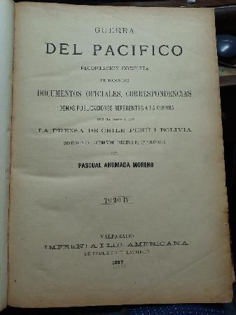 () - Valparaiso - Recopilación completa de todos los documentos oficiales, correspondencias i demas publicaciones referentes a la guerra que ha dado a luz la prensa de Chile, Perú i Bolivia, conteniendo documentos inéditos de importancia - Contiene 544 páginas - Encuadernado en medio cuero - Tapas y lomo con algunos roces- Buen estado |