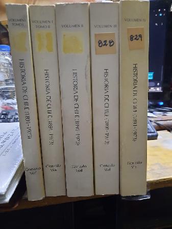 (TBA1) - Santiago de Chile - 5 volúmenes - Incluye: Volumen I, Tomo I: La Sociedad Chilena en el Cambio de Siglo (1891-1920), 423 páginas (año 2001) - Volumen I, Tomo II: La Sociedad Chilena en el Cambio de Siglo (1891-1920), desde página 428 a la 1004 (año 2001) - Volumen II: Triunfo y Decadencia de la Oligarquía (1891-1920), 752 páginas (año 2001) - Volumen III: Arturo Alessandri y Los Golpes Militares (1920-1925), 669 páginas (año 2001) - Volumen IV: La Dictadura de Ibañez (1925-1931), 622 páginas (año 1996) - De la República al Frente Popular (1931-1938), 623 páginas (año 2001) - Todos los volúmenes rústicos - Tapas levemente sucias - Buen estado. |