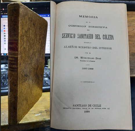 (ON61) - Santiago de Chile - Un volumen original de época de 359 páginas - Dedicado y firmado por el autor en la anteportada - Planos con las estadísticas de los efectos del Cólera - Esta memoria fue presentada al señor ministro del Interior - Una muy buena encuadernación en cuero completo con finos parches y filigranas en lomo - Guardas amarmoladas - Poco roce en bordes del libro - Buen estado |