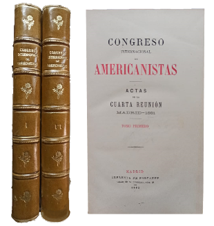 (TAD7) - Madrid - 2 volúmenes - Actas de la Cuarta Reunión. Madrid 1881 - Tomo I contiene 423 páginas, incluyendo índice - Tomo II contiene 417 y más LXXXII páginas correspondiente a los cantos de Yaravies Quiteños - Encuadernados en medio cuero color café con letras y detalles dorados en lomo - Guardas marmoladas - Ambos tomos contienen láminas fijas y desplegables, completas - Leve desgaste en lomo y puntas - Algunas pintas de óxido - Buen estado |