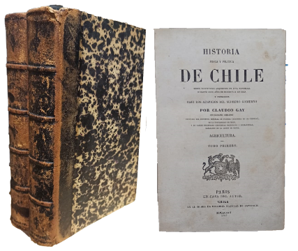 (ZZJ7) - Paris - 2 volúmenes originales de época - Tomo II 1865 - Agricultura - Según documentos adquiridos en esta república durante doce años de residencia en ella y publicada bajo los auspicios del supremo Gobierno - Claudio Gay: Ciudadano Chileno, individuo del Instituto Imperial de Francia (academia de las ciencias), de la Universidad de Chile y de varias sociedades científicas nacionales y estrangeras, Caballero de la Lejion de Honor - Tomo I y II contienen VIII+487 y 450 páginas respectivamente - Ambos ejemplares encuadernados en medio cuero color negro - Lomos gastados y descoloridos - Desgaste en puntas y perímetros - Páginas con pintas de óxido - Marcas de cintas adhesivas en contratapas - Ante portada de tomo I levemente carcomida en un borde - Mancha en canto de tomo I - Estado aceptable |