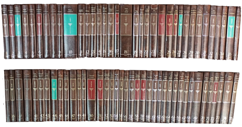 (TBE1) - Altamira, España - Colección Los Grande Pensadores - Tomo del 1 al 19 y luego del 21 al 75 - En total 74 tomos, sólo falta el n°20 - Todos los ejemplares encuadernados en cuero completo de color café con detalles dorados en lomo y tapa - Parches en los lomos, de color café, algunos verdes y rojos - Imagen en los frontispicios - Firma de dueño anterior en hoja de respeto - Algunos ejemplares con leve desgaste en lomo y puntas - En general, todos los ejemplares en buen estado |