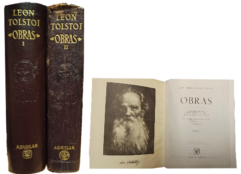(BBA5) - Madrid - En 2 tomos - Versión directa del ruso, prólogo biográfico y notas por Irene y Laura Andresco - Con un estudio grafológico del autor por Matilde Ras y 22 ilustraciones - Tomo I contiene: E poder de las tinieblas, Los frutos de la civilización, El vagabundo, El mujik y el obrero, El cadáver viviente, Infancia, adolescencia, juventud, Felicidad conyugal, Los decembristas, Guerra y paz y Resurrección - Tomo II contiene: Ana Karenina, Hadji-Murat, Lo sonata de Kreutzer, Cuentos, Cuentos para niños, Cuentos populares, Primeros recuerdos y recuerdos y Correspondencia - Tomo I y II contienen 1895 y 1552 páginas respectivamente e incluyendo los índices - Ambos ejemplares encuadernados en cuero completo color morado con detalles dorados en tapa y lomo - Hoja de papel biblia - Imagen en frontispicios - Cantos adornados y guardas con imagen - Tomo I con puntas levemente dobladas - Tomo II con desgaste en lomo y puntas, cantos con mancha de óxido - Buen estado