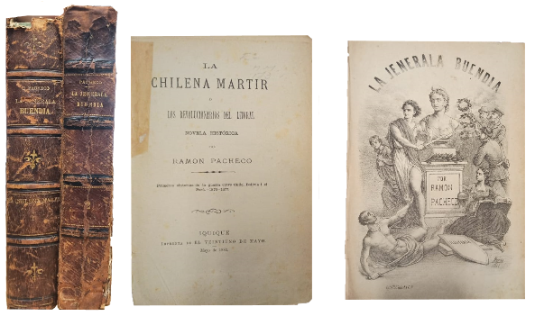 () - Iquique, Chile - 2 volúmenes - Volumen I contiene: La Chilena Mártir o Los Revolucionarios del Litoral, Primeros síntomas de la guerra entre Chile, Bolivia y el Perú-1876-1877. 198 páginas más índice. - Primera parte de La Generala Buendía (Novela Histórica), relacionada con La Guerra entre Chile, Perú i Bolivia. Ilustrada por Luis F. Rojas. 638 páginas incluyendo índice - Tomo II perteneciente a la segunda parte de La Jenerala Buendía contiene 653 páginas incluyendo índice - Ambos ejemplares encuadernados en medio cuero color café - Contienen grabados en blanco y negro - Lomos, tapas, puntas y perímetros gastados - Tapas de tomo I deterioradas, levemente sueltas y con algunas páginas sueltas - Tomo II con tapa superior suelta, lomo levemente partido - Pintas de óxido en algunas páginas - Regular estado |