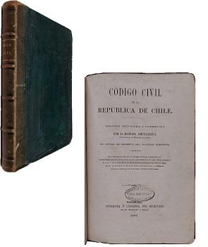 (ZZG3) - Valparaíso, Chile - Edición revisa y correjida por D. Manuel Amunátegui - I adicionada con el Mensaje del Ejecutivo al Congreso Nacional, el Reglamento del Rejistro Conservatorio de bienes raíces, las leyes sobre Habilitación de edad i Efecto retroactivo de la lei, i con la carta del Sr. D. Andrés Bello que inteepreta el art. 1618 del Código, la cual va intercalada en las NOTAS ESPLICATIVAS, que han sido correjidas de los errores i omisiones con que se habían publicado anteriormente - Contiene XI+516 páginas incluyendo índice - Encuadernado en medio cuero color verde con detalles dorados en lomo - Leve desgaste en lomo, tapas, perímetros y puntas - Páginas con pintas de óxido - Timbre de librería anterior en portada - Buen estado |
