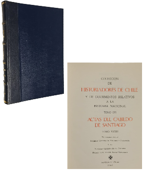 () - Santiago de Chile - Tomo LVI de la colección - Volumen XXXIII de las Actas del Cabildo de Santiago - Sociedad Chilena de Historia y Geografía y la Academia Chilena de la Historia - Prólogo de D. Manuel Salvat Monguillot - Comisión editora: Guillermo Donoso Vergara, Fernando Campos Harriet, Armando Moreno Martín y José Barros Franco - Contiene XIII+LXXV+ 229+XXVII páginas incluyendo notas Histórico-Biográficas, prólogo e índice - Encuadernado en medio vinilo color azul con detalles dorados en lomo - Conserva tapas originales - Buen estado |