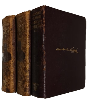 (VIT) - Madrid - 3 volúmenes - Traducción directa del ruso, introducción, prólogos, notas y censo de personajes por Rafael Cansinos Assens, Correspondiente de la Real Academia Goethiana, de Sao Paulo (Brasil) - Tomo I y II del mismo año de edición, Tomo III del1961 - Tomo I: 1844-1855. Contiene Su vida y su obra, Pobres gentes, El doble, El señor Projarchin, La patrona, entre otras obras. Con 20 ilustraciones reproducidas de la edición rusa de Leonid Grossmann - Tomo II: 1866-1876. Contiene Crimen y castigo, El jugador de (De las memorias de un joven Igrok), El idiota, El eterno marido, entre otras obras - Tomo III: 1879-1881. Contiene Los hermanos Karamásov, Diario de un escritor, Del Dostoyevski inédito, Vida de un gran pecador, entre otras obras Tomo I, II y III contienen 1570, 1937 y 1760 páginas respectivamente e incluyendo índices - Todos los ejemplares encuadernados en cuero completo de color morado con detalles dorados en lomos y tapas - Tomo I y II con sus cantos adornados - Ilustración en los frontispicios - Hoja de papel biblia - Guardas adornadas - Tomo I con manchas de humedad - Tomo I y II con lomos, perímetros y puntas gastados, levemente descoloridos - Tomo III con leve desgaste en lomo y perímetros - Estado aceptable