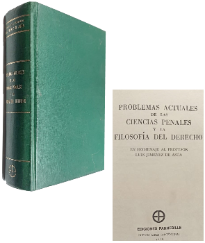 (VVM3) - Buenos Aires - En Homenaje al Profesor Luis Jiménez de Asúa - Comité editor: Mariano Jiménez Huerta, Enrique Bacigalupo, Marino Barbero Santos, entre otros - Contiene XII+805 páginas incluyendo índice - Encuadernado en tela completa de color verde, con detalles dorados en lomo - Imagen en frontispicio - Escasos roces en lomo y puntas - Leve suciedad en tapas - Buen estado |