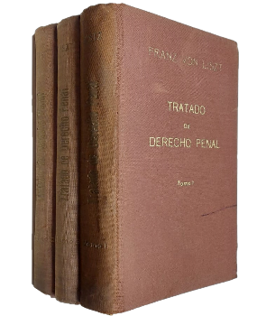(VV21) - Madrid - 3 tomos - Volumen XI de la Biblioteca Jurídica de Autores Españoles y Extranjeros - Tomo I: Traducido de la 18° edición alemana y adicionado con la Historia del Derecho Penal en España por Quintiliano Saldaña. Contiene 625 páginas incluyendo índice - Tomo II y III: Traducido de la 20° edición alemana por Luis Jiménez de Asúa y adicionado con el Derecho Penal Español por Quintiliano Saldaña. Contienen 494 y 463 páginas respectivamente - Todos los ejemplares encuadernados en tela completa con letras doradas en las tapas - Roces en lomo y puntas - Lomos levemente descoloridos - Firma de dueño anterior en hoja de respeto - Timbre de dueño anterior en ante portadas - Tomo I con sus primeras y últimas páginas rasgadas sin afectar contenido, con marca de lápiz de pasta en tapa delantera - Estado aceptable |