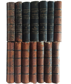 (TBF5) - Santiago de Chile - 14 volúmenes, falta n° 7 - Edición hecha bajo la dirección del consejo de instrucción pública en cumplimiento de la lei de 5 de setiembre de 1872 - Volumen I: Filosofía del Entendimiento. XVII+512 páginas - Volumen II: Poema del Cid. XXVI+416 páginas - Volumen III: Poesías (El Anauco, Las Fantasmas, La oración por todos, El cóndor i el poeta, entre otras poesías). LXXXIV+570 páginas - Volumen IV: Gramática de la Lengua Castellana. XLI+494 páginas - Volumen V: Opúsculos Gramaticales. LXVII+507 páginas - Volumen VI: Opúsculos Literarios i Críticos Parte I. CXLII+480 páginas - Volumen VIII: Opúsculos Literarios i Críticos Parte III. CXII+484 páginas - Volumen IX: Opúsculos Jurídicos. CXXIII+508 páginas - Volumen X: Derecho Internacional. XXXVI+627 páginas - Volumen XI: Proyectos de Código Civil. XIII+622 páginas - Volumen XII: Proyecto de Código Civil (1853). XVIII+644 páginas - Volumen XIII: Proyecto Inédito de Código Civil. XLIII+625 páginas - Volumen XIV: Opúsculos Científicos. LVII+560 páginas - Volumen XV: Miscelánea. XLVII+447 páginas - Todos los ejemplares encuadernados en medio cuerdo de color café con detalles dorados en lomos - Guardas marmoladas - Lomos gastados, algunos con leve merma de material en bordes - Desgaste en tapas, perímetros y puntas - Algunos ejemplares con manchas de humedad en contratapas - Volumen X con leve deterioro en lomo - Timbres de librería anterior en portada - Correcto estado |