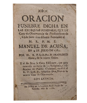 (OE41) - Lima - Y al fin lleva la Carta Edificante, que para recuerdo exemplar de los Religiosos, y edificación del Pueblo Christiano, escribió el R. P. Lect. Fr. Sebastián Díaz, Prior de la misma Casa de Observancia. Con licencia - Dedicatoria a nuestro Santísimo y Gloriosisimo P. Sto. Domingo de Gusman, Ilustre Fundador de el Sagrado Orden de Predicadores - Contiene 60 páginas - Rústico - Cantos adornados - Desgaste en lomo, perímetros, tapas y puntas - Leve merma de material en lomo en borde superior e inferior - Leve merma de material en tapa trasera, en borde superior - Algunas páginas con pintas de óxido - Tapas con manchas, con suciedad - Estado aceptable