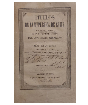 (ON12) - Santiago de Chile - Firmado y dedicado por autor en portada, por sus siglas - Reputación de la memoria que ha publicado en Buenos Aires el Doctor Don Dalmacio Velez Sarsfield bajo el nombre de Discusión de los títulos del Gobiernos de Chile a las tierras del Estrecho de Magallanes - Contiene 140 páginas - Encuadernado en media tela de color conchevino, con letras doradas en lomo - Conserva tapa original - Roces en lomo, perímetros y puntas - Algunas pintas de óxido - Buen estado |