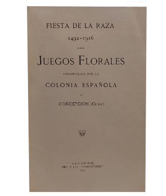 (TE32) - Concepción - Fiesta de la Raza, 1492-1916 - Homenaje Literario a la Reina de los Juegos Florales de la Raza , señorita Blanca Pimentel de los Reyes, página 327 a 339 - Contiene 339 páginas más índice - Encuadernado en tela completa con parche negro en lomo - Contiene fotografías en blanco y negro - Buen estado |