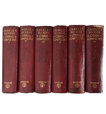 (LC5A) - Madrid - 6 tomos, colección completa - Traducción, ensayo biográfico y notas de José Mendez Herrera - Tomo I contiene: Papeles póstumos del Club Pickwick, Canción de navidad, El grillo del hogar, El hechizado, Novela de vacaciones, entre otros títulos. 1836 páginas - Tomo II contiene: Vida y aventuras de Nicolás Nickleby, La tienda de antigüedades, Tiempos difíciles, Grandes esperanzas, entre otros títulos. 1830 páginas - Tomo III contiene: Dombey e hijo, Una historia de Inglaterra para los niños, Vida y aventuras de Martín Chuzzlewit, entra otros títulos. 1958 páginas - Tomo IV contiene: David Copperfield, Bernabé Rudge, Trabajos en "Palabras del hogar", entre otros títulos. 1784 páginas - Tomo V contiene: La casa deshabitada, Nuestro común amigo, Cuentos de navidad y Paisajes de Italia, entre otros títulos. 2031 páginas - Tomo VI contiene: La pequeña Dorrit, Edwin Droot, El viajante no comercial, entre otros títulos. 1917 páginas - Todos los ejemplares encuadernados en cuero completo original de editorial de color rojo, con letras doradas en tapas y lomos - Guardas con imágenes - Cantos adornados - Hoja de papel tipo biblia - Contienen algunas imágenes en blanco y negro - Imagen en frontispicios - Roces en lomos, perímetros y puntas - Tomo II con leves rasgaduras en las guardas delanteras, en articulación - Tomos III y IV con leve mancha en lomo y tapa respectivamente - Tomo VI con muy leve falta de material en borde superior de lomo y refuerzo interno en articulaciones por dueño anterior - Buen estado |
