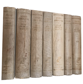 (LC5E) - Madrid - Tomos I, II, III, IV, V,VI y VIII, faltando el n° VII y IX - Tomo I (1902-1916) contiene: Glosas, Canto a los muertos, a los deberes y a los ideales, La teología de Renán, Arte de este mundo y del otro, Meditaciones del Quijote, Shylock, entre otros títulos. 573 páginas más índice - Tomo II: "El Espectador" (1916-1934). 745 páginas - Tomo III (1917-1928) contiene: Un libro sobre la Filosofía del Derecho, La muerte de Galdós, Pedagogía y Anacronismo, Las Atlántidas, El arte en presente y en pretérmino, entre otros títulos. 636 páginas - Tomo IV (1929-1933) contiene: Sobre el vuelo de las aves anilladas, La rebelión de las masas, Misión de la Universidad, Goethe desde dentro, entre otros títulos. 553 páginas - Tomo V (1933-1941) contiene: En torno de Galileo, Misión del bibliotecario, Ensimismamiento y alteración, Estudios sobre el amor, entre otros títulos. 625 páginas - Tomo VI (1941-1946) "Brindis y prólogos".511 páginas - Tomo VIII (1958-1959) contiene: Prólogo para Alemanes, Meditación del pueblo joven, Introducción a Velásquez, entre otros títulos.665 páginas - Todos los ejemplares encuadernados en tela completa de color gris - Algunos roces en tomos y puntas - Algunos ejemplares con timbre de dueño anterior en hoja de respeto - Lomos levemente oscurecidos - Leve suciedad en tapas - Buen estado