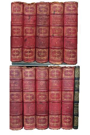(Vitrina) - Paris - 10 volúmenes + Continuación de la Historia Universal "Los Últimos Treinta Años" - Colección abarca desde "Desde la creación hasta la dispersión de los hombres" hasta - Traducida del italiano conforme a la última edición de Turín, única edición española completa, aprobada por el autor, hecha a su vista y con su cooperación - Ilustrada con láminas, retratos y mapas - Los Últimos Treinta Años escrita en italiano y traducida al español por D. G. Aguado de Lozar, edición aprobada por el autor e ilustrada con láminas. VII+178 páginas - Los 10 volúmenes encuadernados en medio cuero completo de color rojo con detalles dorados en los lomos mientras que la continuación se encuentra encuadernada en medio cuero de color verde - Guardas adornadas - Contienen grabados - Desgaste en lomos, tapas, perímetros y puntas - Pintas de óxido en páginas - Tomo I con tapa levemente desarticulada de lomo - Buen estado |