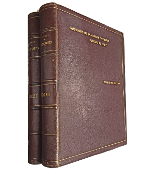 (TAR6) - Santiago de Chile - 2 volúmenes - Tomo I y II contienen 309 y 269 páginas respectivamente - Ambos ejemplares encuadernados en cuero completo de color con letras doradas en lomo y tapas - Contiene láminas a color con los escudos de cada familia - Roces en lomos y puntas - Hojas quebradizas - Considerable merma de material de página página 13 del volumen I - Timbres de librería anterior en ante portada de ambos ejemplares - Correcto estado |