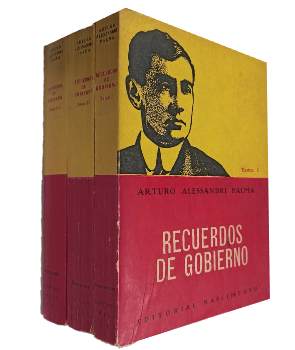 (TAM5) - Santiago de Chile - 3 tomos - Edición a cargo de Guillermo Feliú Cruz - Dedicado por un hijo y eminente procesalista de la época Fernando Alessandri y además una tarjeta de presentación - Portada: Osvaldo Salas - Tomo I: Administración 1920-1925. Prólogo: El hombre de Estado, el político, el orador, el abogado por Carlos Silva Vildósola. XXIII+421 páginas - Tomo II: El exilio, Otra vez en el gobierno. La lucha por la libertad 1924-1923. Prólogo: Alessandri, Estadística por Juvenal Hernández. XVIII+493 páginas - Tomo III: XL+592 páginas. Administración 1932-1938. Prólogo: Alessandri, personaje de la historia por Guillermo Feliú Cruz - Ejemplares con encuadernación rústica - Roces en lomos, perímetros y puntas - Tapas con leve suciedad -Perímetros partidos - Tomo I con marcas de cinta adhesiva por dueño anterior - Correcto estado |