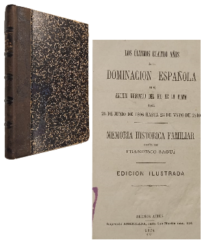 (TF21) - Buenos Aires - Memoria histórica familiar escrita por Francisco Saguí - Edición ilustrada - Contiene XIII+324 páginas - Prólogo y firmado y dedicado por Miguel Esteves Saguí - Encuadernado en medio cuero de color negro, con letras doradas en lomo - Lomo, perímetros y puntas gastados - Cantos con leve mancha de humedad - Buen estado |
