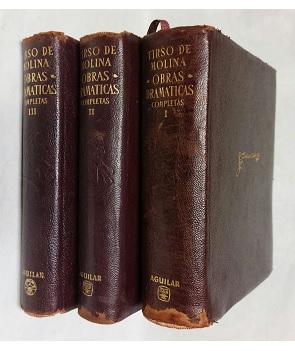 (BBA5) - Madrid, España - Edición Crítica por Blanca de Los ríos - Esta edición, de todas las que se han publicado, 3 volúmenes, contienen 85 comedias y seis autos, y todo el teatro conocido de tirso de Molina - Con 2045, 1519 y 1448 - Los 3 tomos con encuadernación original en cuero completo, hoja papel biblia, cantos adornados y guardas con diseño - Bordes de lomo gastado, tomo I más que II y III - Puntas con roces - Interior excelente - En general, buen estado |