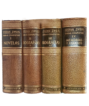 (LC5A) - Barcelona - Colección Clásicos y Modernos - I: Novelas contiene: La piedad peligrosa, Novela veraniega, La calle del claro de luna, entre otras obras - II: Biografía I, contiene: María Antonieta, Balzac, Dostoiewski, Magallanes, Tolstoi, entre otros - III: Biografía II contiene: María Stuardo, Fouche, La tragedia de una vida, Rilke, entre otros - IV: Memorias y Ensayos contiene: Momentos estelares de la humanidad, La lucha contra el demonio, Tiempo y mundo y el Mundo de ayer, entre otros - Tomo I,II,III y IV contienen 1396, 1322, 1369 1668 páginas respectivamente e incluyendo los índices - Todos los ejemplares encuadernados en cuero completo color verde, con detalles dorados en tapa y lomo - Retrato en frontispicio - Roces en lomo, tapas, perímetros y puntas - Buen estado |