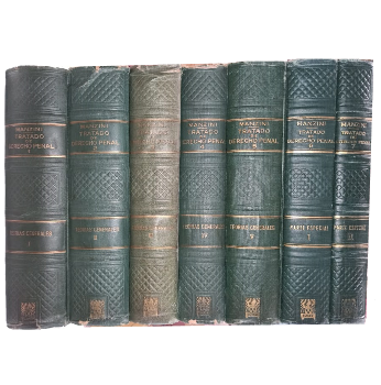 (TAZ4) - Buenos Aires - 7 volúmenes de 10, faltan los 3 últimos de la parte especial - Traducción y edición al cuidado de Santiago Sentis Melendo - Prólogo y notas de Derecho Argentino por Ricardo C. Núñez y Ernesto R. Gavier - Traducción de la obra italiana Trattato di Diritto Penale Italiano - Volumen I: Primera parte, Teorías Generales. XXXII+655 páginas - Volumen II (: Teorías Generales II. XX+609 páginas - Volumen III (1949): Teorías Generales III. XVI+499 páginas - Volumen IV (1949): Teorías Generales IV. XVI+540 páginas - Volumen V (1954): Teorías Generales V: XIX+546 páginas - Volumen VI (1957): Segunda parte de los Delitos en Especial, volumen I. Traducción de Santiago Sentis Melendo y Marino Ayerra Redin. XXIII+496 páginas - Volumen VII(1957): Segunda parte de los Delitos en Especial, volumen II. XX+398 páginas - Todos los ejemplares encuadernados en tela completa de color verde a excepción del tomo V que se encuentra en media tela de color verde - Todos los volúmenes con desgaste en los lomos, tapas, perímetros y puntas - Timbre de dueño anterior en hojas de respeto, anteportadas y portadas - Volumen II, III y IV con mayor desgaste en borde superior del lomo - Páginas levemente quebradizas - Tomo III con gran mancha de humedad en tapa delantera y lomo, además de algunas manchas al interior en las primeras páginas, el resto bien conservado - Algunas puntas con leve abolladuras - Correcto estado