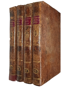 (TAN8) - Madrid - 4 tomos - Con la declaración de muchas frases, y voces de la Sagrada Escritura, y varias reflexiones morales, tomadas de los Santos Padres, y Expositores de mejor nota - Se da en el, una noticia puntual de su vida, y hechos más principales de los Patriarcas del Viejo Testamento: De los Juezes, Reyes, y Caudillos del Pueblo de Dios: de los Profetas, Apóstoles, Evangelistas, y sus escritos: de los Discípulos de Jesu-Christo, y primeros Fieles de la Iglesia: de las Mugeres famosas en la Escritura: de los Reynos, Provincias, Ciudades, Montes, Valles, Rios, y Fuentes, Animales, Arboles, Plantas, Piedras preciosas, y otras cosas, cuyos nombres de encuentran en la Vulgata de San Pio V - Por el P. M. F. Joseph Armesto y Goyanes, Ex-Abad y Cura del Real Monasterio y Parroquia de S. Martin del Orden de S. Benito, y Don Vicente Sarratel - Tomo I: Letras A-F. VII+399 páginas - Tomo II: Letras G-L. 391 páginas - Tomo III: Letras M-Q. 411 páginas - Tomo IV: Letras R-Z. 427 páginas - Los 4 ejemplares encuadernados en pasta española de época, con parches rojos y adornos dorados en los lomos - Guardas marmoladas - Desgaste natural en lomos, tapas, perímetros y puntas - Algunas páginas con pintas de óxido - Firma de dueño anterior en ante portadas - Timbre de dueño anterior en portadas - Tomos con manchas de humedad en algunas páginas, tomo IV con mancha considerable desde ante portada hasta páginas n°9 sin afectar contenido - Interior bien conservado - Buen estado |