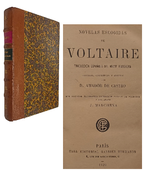 (TE11) - Paris - Traducción Española del Abate Marchena - Revisada, completada y anotada por D. Amador de Castro - Con noticias biográfico-literarias acerca de Voltaire - Contiene VIII+392 páginas incluyendo índice - Encuadernado en medio cuero color café con parches rojo y azul en lomo - Guardas marmoladas - Cantos adornados - Desgaste en lomo, perímetros y puntas - Pequeñas pintas de óxido - Interior bien conservado - Buen estado |