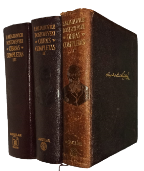 (OE61) - Madrid - 3 tomos - Traducción directa del ruso, introducción, prólogos, notas y censo de personajes por Rafael Cansinos Assens - Con 20 ilustraciones reproducidas de la edición rusa de Leonid Grossman "Vida y obras de F. M. Dostoyevski" - Tomo I Año 1949: (1844-1865). Contiene: Pobres gentes, El Señor Projarchin, Corazón débil, La mujer ajena y el hombre debajo de la cama, Memorias de la casa muerta, Memorias del subsuelo, entre otros títulos. 1532 páginas - Tomo II Año 1961: (1866-1876). Contiene: Crimen y castigo, El jugador, El idiota, El eterno marido, El adolescente, entre otros títulos. 1917 páginas - Tomo III Año 1969: (1879-1881). Contiene: Los hermanos Karamásovi, Diario de un escritor, Vida de un gran pecador, entre otros títulos. 1760 páginas - Ejemplares encuadernados en cuero completo original de editorial, con detalles dorados en lomos y tapas - Retrato de autor en frontispicio de cada ejemplar - Tomo I con sus cantos adornados - Tomo I y II con guardas ilustradas - Hoja de papel tipo biblia - Desgaste en lomos y puntas - Poca suciedad en cantos - Buen estado |