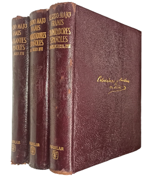 (BBA2) - Madrid - 3 tomos - Tomo I Navegantes contiene: Cristóbal Colón, La insigne familia Pinzón, Pedro Alonso Niño, Lucas Valle de Ayllón, Juan Ponce de León, Francisco de Orellana, Isabel Barreto, entre otros. Con 46 ilustraciones - Tomo II Conquistadores contiene: Vasco Núñez de Balboa, Francisco Fernández de Córdova, Hernán Cortés, Juan de Oñate, Francisco Pizarro, Pedro de Valdivia, entre otros. Con 98 ilustraciones - Tomo III Colonizadores y Fundadores en Indias contiene: La primera colonización, Los reinos de Indias en su vida social y cultural, Los Virreinatos nuevos, La Conquista hasta la independencia, entre otros. Con 11 ilustraciones - Tomo I, II y III contienen 1348, 1414 y 1301 páginas respectivamente - Ejemplares encuadernados en cuero completo original de editorial, con detalles dorados en lomos y tapas - Guardas ilustradas - Hoja de papel de tipo biblia - Retrato de autor en frontispicio de cada ejemplar - Cantos adornados - Desgaste en lomos y puntas - Tomo I levemente descolorido en canto - Tomo III con pequeña merma en punta inferior - Algunas páginas con pintas de óxido - Buen estado |