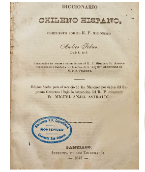 (OO52) - Santiago de Chile - 2 partes en mismo volumen - Enriquecido de voces i mejorada por Antonio Hernández i Calzada de la Orden de la Regular Observancia de N. P. S. Franciscos - Edición hecha para el servicio de las Misiones por orden del Supremo Gobierno i bajo la inspección del R. P. misionero Fr. Miguel Astraldi - Parte I: Chileno-Hispano. 87 páginas - Parte II: Imprenta del Progreso. Hispano-Chileno. 108 páginas - Timbre del dueño anterior en portada - Falta anteportada - Encuadernado en medio cuero de color negro, con letras doradas en el lomo - Desgaste en lomo, tapas, perímetros y puntas - Algunas páginas con pintas de óxido - Algunas páginas con pequeños agujeros, no afecta contenido - Interior en general bien conservado - Correcto estado. |
