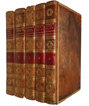 () - Paris - 5 tomos - Redactado por Alejandro de Humboldt; Continuación indispensable al ensayo político sobre el reino de la nueva España, por el mismo autor - Con mapas geográficos y físicos - (Tomo I) Libro primero: Partida de España, Arriba a las Islas Canarias, Permanencia en Tenerife, Viage de Santa Cruz a la Oratavam Excursión a la cumbre del pico de Teides, Travesía de Tenerife a las costas de la América Meridional, Reconocimiento de la Isla de Tabago y Llegada a la Cumaná. Libro II: Primera morada en Cumaná, Orillas del Manzanares, Península de Araya, Pantanos o lagunas Salidas y Ruinas del Castillo de San Lago. Contiene LXVII+368 páginas - (Tomo II) Libro III: Montañas de la Nueva-Andalucía, Valle de Cumanacoa, Cima del Cocollar, Misión de los indios Chimas, Convento de Caripe, Cueva del Guacharo, Aves nocturnas, Partido del Caripe, Montaña y bosque de Santa María, Misión de Captuaro ,entre otros. Libro IV: Segunda mansión en Cumaná, Temblores de tierra, Meteoros Extraoidinarios, Travesía de Cumaná y Guaira, Chorro de la Guaira a Caracas, Vista general sobre las provincias de Venezuela, Mansión en Caracas, entre otros. Libro V: Terremotos de Caracas, Relación de este fenómeno con las erupciones volcánicas de las islas Antillas, Partida de Caracas, Montañas de San Pedro y de los Teques, La Victoria, Valles de Aragua, Lago de Tacarigua, Manantiales calientes de Mariara, entre otros. Libro Sexto: Montañas que separan los valles de Aragua de los llanos de Caracas, Villa de Cura, San Fernando de Apure, Trabamiento y ramificación de los rios de Apure y Arauca, entre otros. Contiene 516 páginas incluyendo índice - (Tomo III): Libro VII: Confluencia de los rios Apure y Orinoco, Montes de la Encaramada, Embocadura del rio Anaveni, Pico de Unania, Misión de Atures, Catarata o raudal de Mapara, Raudal de Garcita, Maipures, Cataratas de Quintuna, San Fernando de Atabapo, San Baltasar, Portage o arrastradero del Tusuamini en el Rio Negro. Libro VIII: Río Negro, Límites de Brasil, Alto Orinoco desde la Esmeralda hasta el confluente del Guaviare, Segundo paso por medio de cataratas de Atures y Maipures, Bajo Orinoco entre la embocadura del rio Apure y Angostura, Capital de Guayana Española. Contiene 430 páginas incluyendo índice. (Tomo IV): Continuación del capítulo Veinte y Cuatro del tomo III, Bajo Bajo Orinoco entre la embocadura del rio Apure y Angostura, Capital de la Guayana Española. Contiene 368 páginas - (Tomo V): Continuación del capítulo Veinte y Seis del tomo IV. Libro Nono, Posibilidad y medio de hacer canales, para facilitar las comunicaciones entre las diversas provincias que componen la república de Colombia, Bosquejo de un cuadro geognóstico de la América meridional, al norte del Río de las Amazonas y al este del meridiano de la Sierra Nevada de Mérida. Sección I: Configuración del país, Desigualdades del suelo, Cadenas y grupos de montañas, Puntas o alturas de partición y Llanuras o llanos. Sección II: Repartición general de los terrenos, Dirección e inclinación de las capas, Altura relativa de las formaciones sobre el nivel del Océano. Sección III: Naturaleza de las rocas, Edad relativa y superposión de las Formaciones, Terreno primitivo de transición, secundario, terciario y volcánico. Contiene 390 páginas - Ejemplares encuadernados en cuero completo de época, con adornos dorados en tapas y lomos - Parche rojo en lomos - Guardas y cantos marmolados - Tomo I contiene grabado en portada y plano desplegable al final del ejemplar, coloreado a mano - Tomo II, III, IV y V contienen mapa desplegable al final de cada ejemplar - Desgaste natural en lomos. tapas, perímetros y puntas - Algunas manchas de humedad en cantos, bordes de guardas y páginas - Algunas páginas con pintas de óxido - Algunos mapas con roturas, sin afectar mayormente la integridad de los mapas - Algunos ejemplares firmados por dueño anterior - Algunas puntas con pequeñas mermas - Interior bien conservado - Correcto estado |